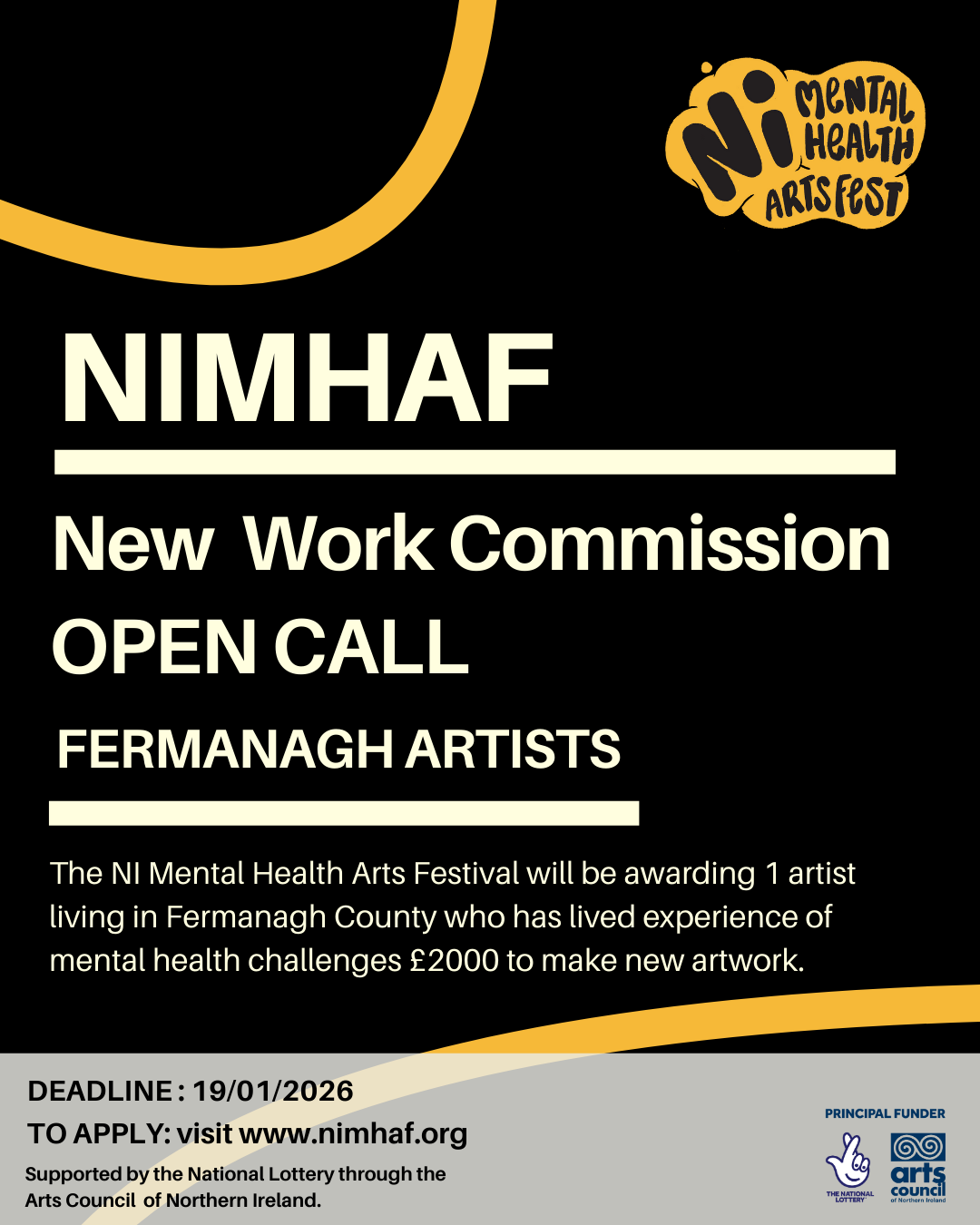 The NI Mental Health Arts Festival is delighted to announce our New Works Commission. We will be awarding 6 artists who have lived experience of mental health challenges £2000 to make new artwork. We are currently operating an open call for Fermanagh based artists.