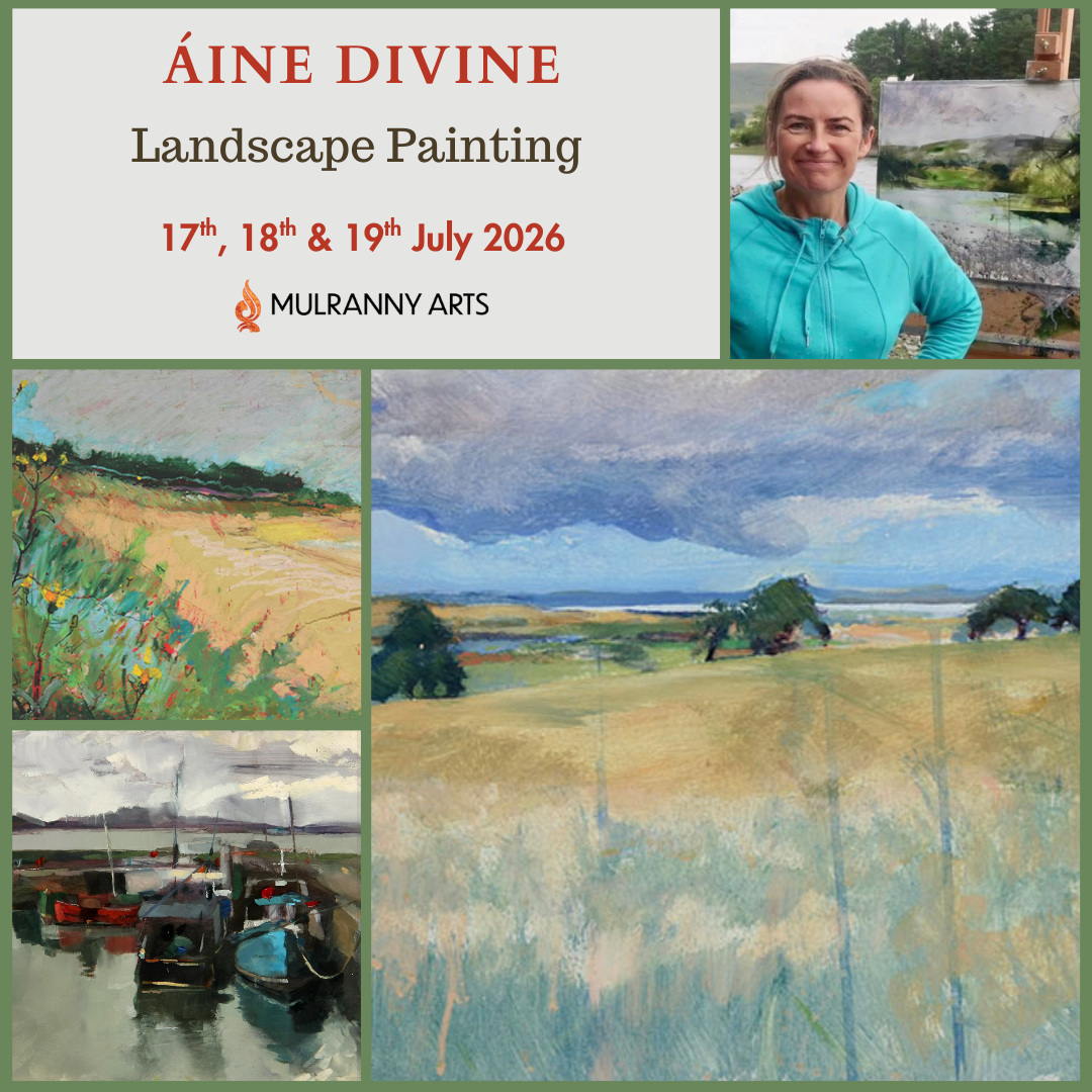 Join acclaimed artist Áine Divine for a three-day landscape painting workshop at Mulranny Arts next July. Drawing inspiration from the Mulranny coastline, participants will paint on location and develop layered studio work using paint, collage and mixed media. Áine guides the process from quick tonal studies to finished paintings. Lunch each day is included in the class fee. A full list of supplies to bring is available on the Mulranny Arts website, with additional materials available to purchase during the workshop.