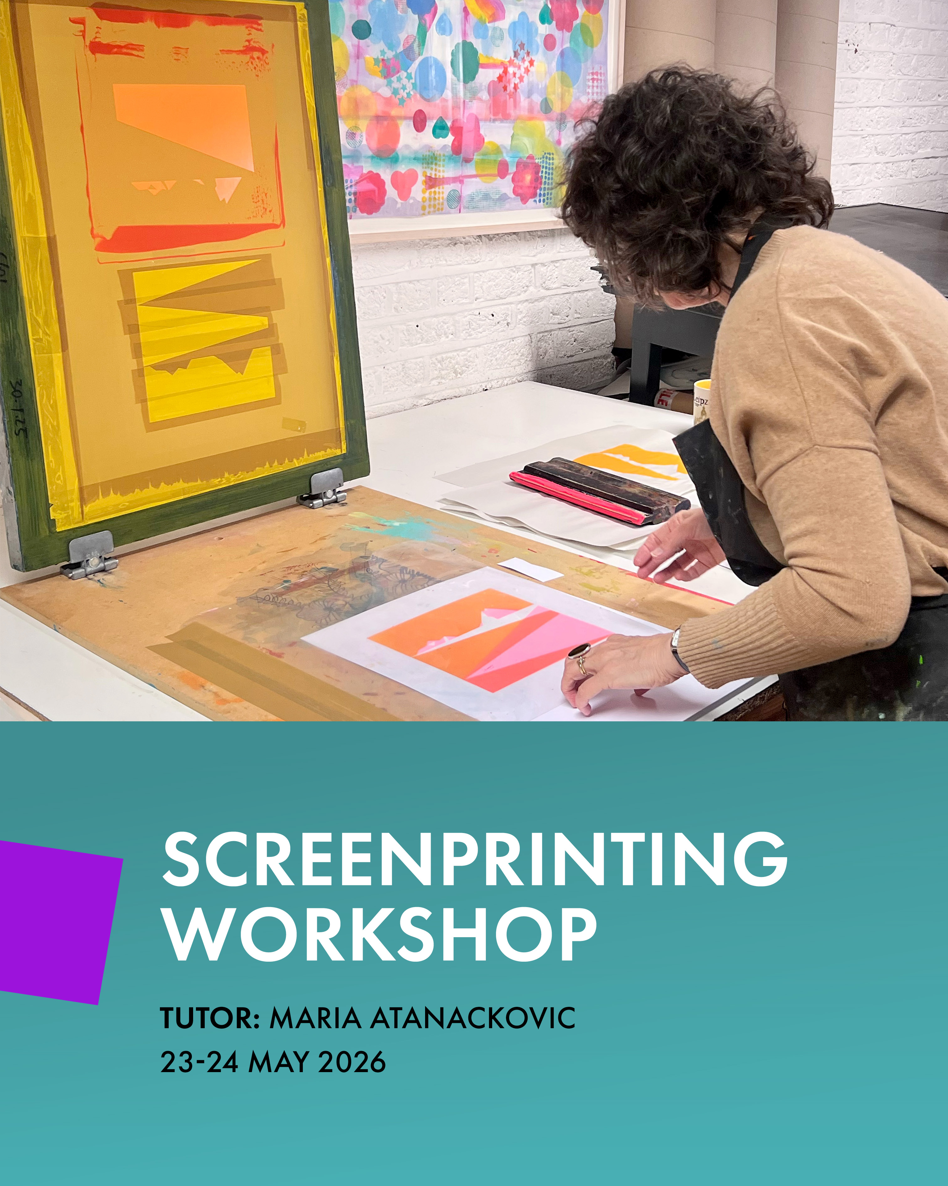 A two-day workshop developing screenprinting skills. Prepare and expose screens, experiment with colour and registration, and produce a finished edition of prints. Suitable for all skill levels.
