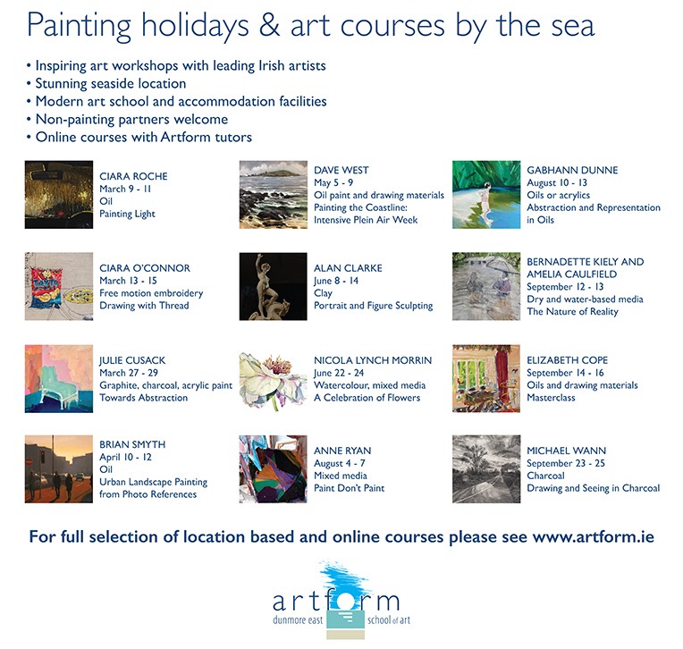 Artform School of Art offers residential artist-led seaside art courses in the beautiful coastal village of Dunmore East, Co. Waterford for all skill levels in a variety of styles and media, hosted by some of Irish leading artists, and taking place in Artform light-filled seaside studio with 24hr access for each artist. We hold open call competitions, exhibitions, art events and artist residencies. To find out more, get in touch or visit us in Dunmore East.