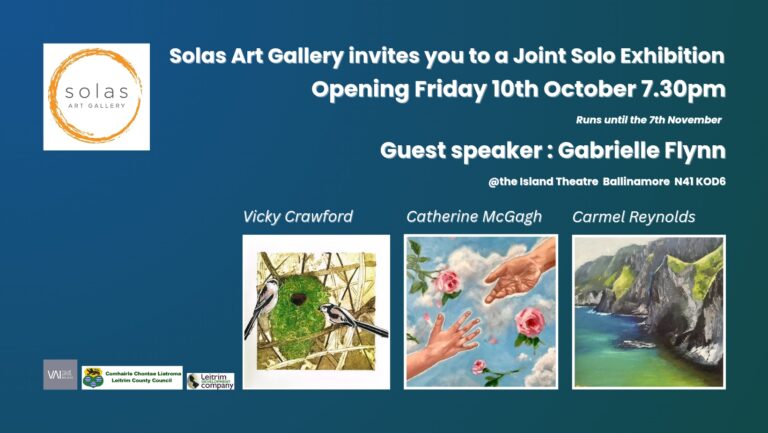 Solas Art Gallery welcomes you to the launch of the joint solo exhibition of three Leitrim-based artists, Vicky Crawford, Catherine McGagh and Carmel Reynolds, each embarking on their own creative expression of nature and soul. The opening night is on Friday 10th October at 7.30 pm at the Island Theatre, N41 KOD6, Ballinamore.
